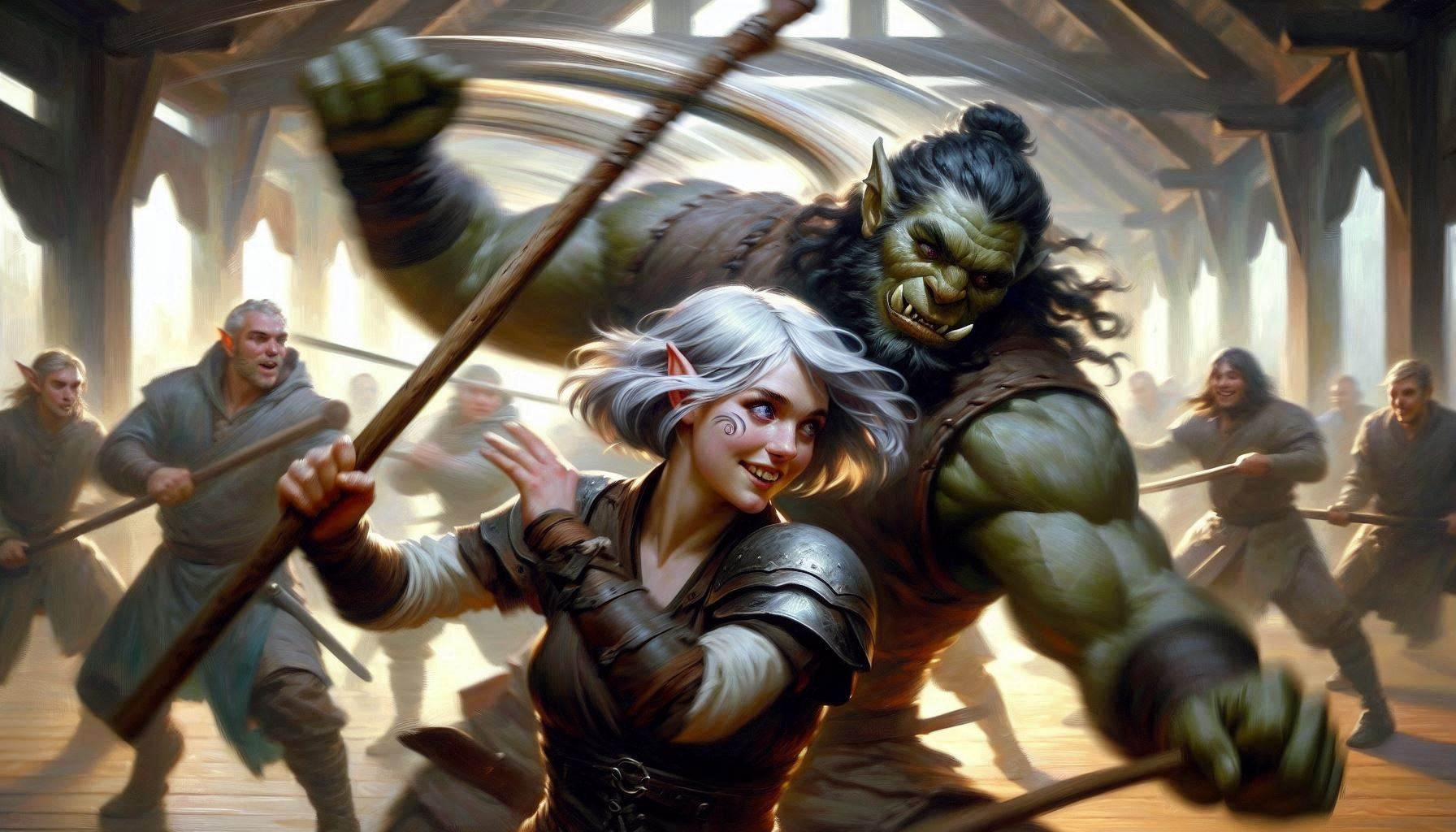 “Keith Parkinson painting;in motion;(half-elf woman,french,blurred motion,spinning with wood staff) sparring with (large half-orc guard,swinging wood staff overhead): 1) (half-elf woman,french,short unkempt bob white hair,mischievous smile,age 24,purple eyes,black leather armor,small tattoo on cheek); 2) (large half-orc city guard,muscular,age 28,male,german,tall,grayish-green skin,goatee,black hair in neat topknot,heavy leather armor,big grin);in training hall”