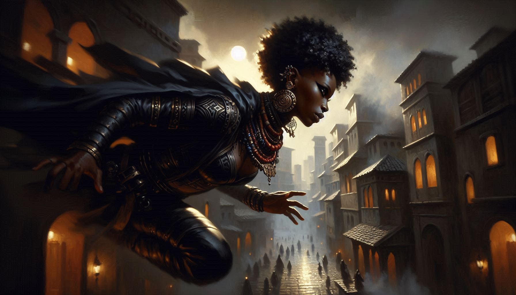 “Yoruba woman,(age 32);short curly hair,large earrings,neck rings,bead necklace,disdainful,haughty,predatory,black leather armor;(oil paint),drawing,(rpg portrait),(dark fantasy),(dark shading),d&d”