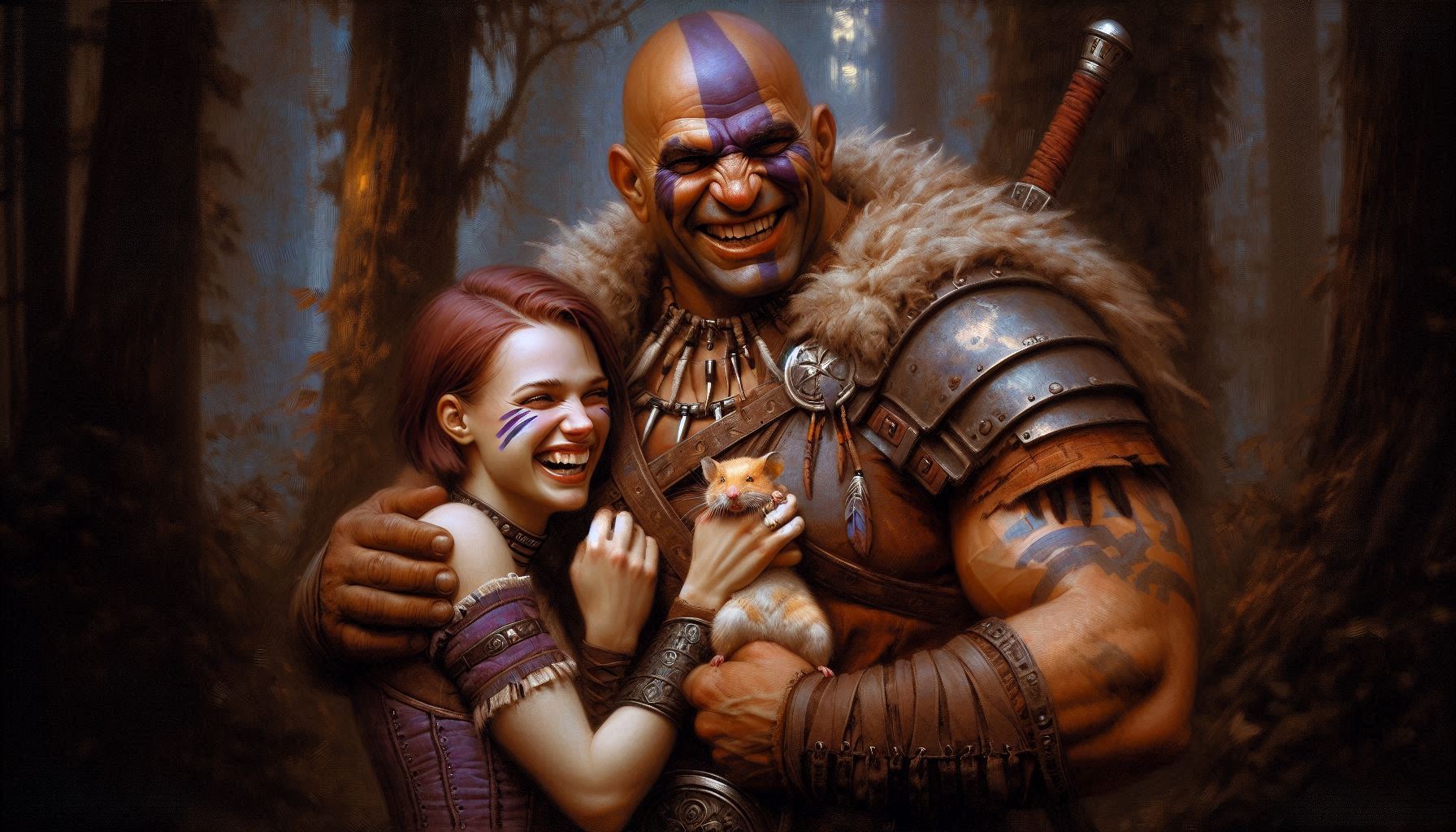“bald cherokee man cradling and talking to a small hamster,smooth chin,large,muscular,large purple face tattoo,war-rings,leather armor,battle scarred,kind,age 30,bald,barrel chested,brown eyes;in the forest;oil paint,drawing,dark fantasy,rpg portrait,soft focus,d&d,dark shading“