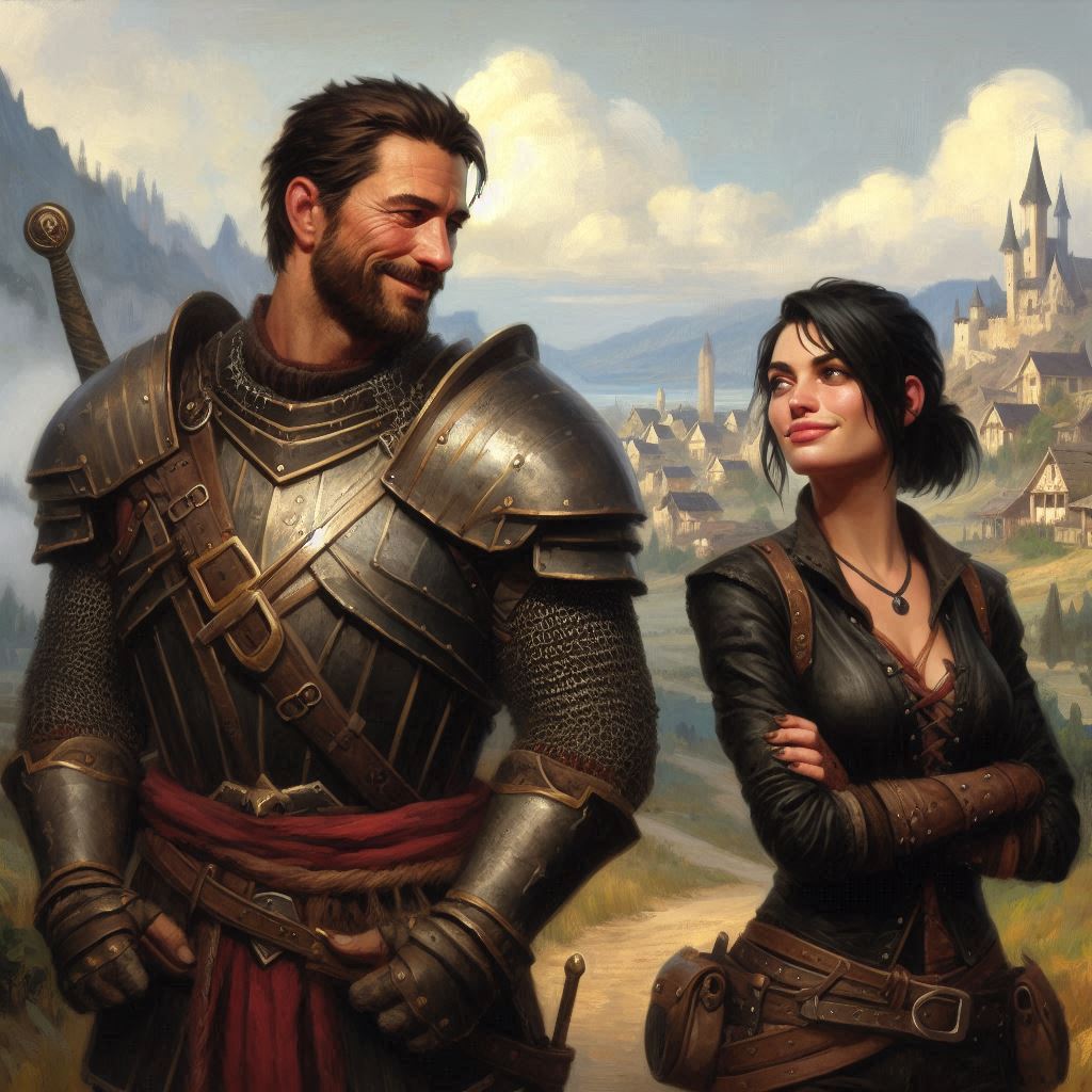 “jeff easley fantasy painting;french paladin man,early 40s,muscular,haggard,broad chin,dark blonde hair,blue eyes,goatee,rusty chainmail,friendly smile;standing in hills overlooking frontier town“